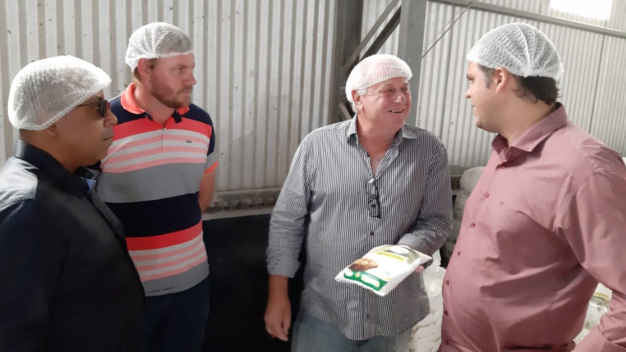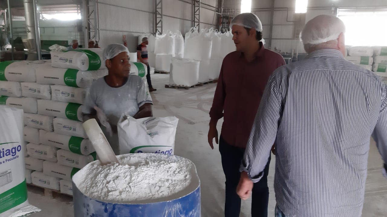 Conversando com as lideranças comunitárias e empresariais sobre as demandas da comunidade. Juntamente com o empresário Caçula conhecemos a fábrica Santiago que desenvolve um trabalho em conjunto com a cooperativa da agricultura familiar para a produção de 50 toneladas de farinha por dia.